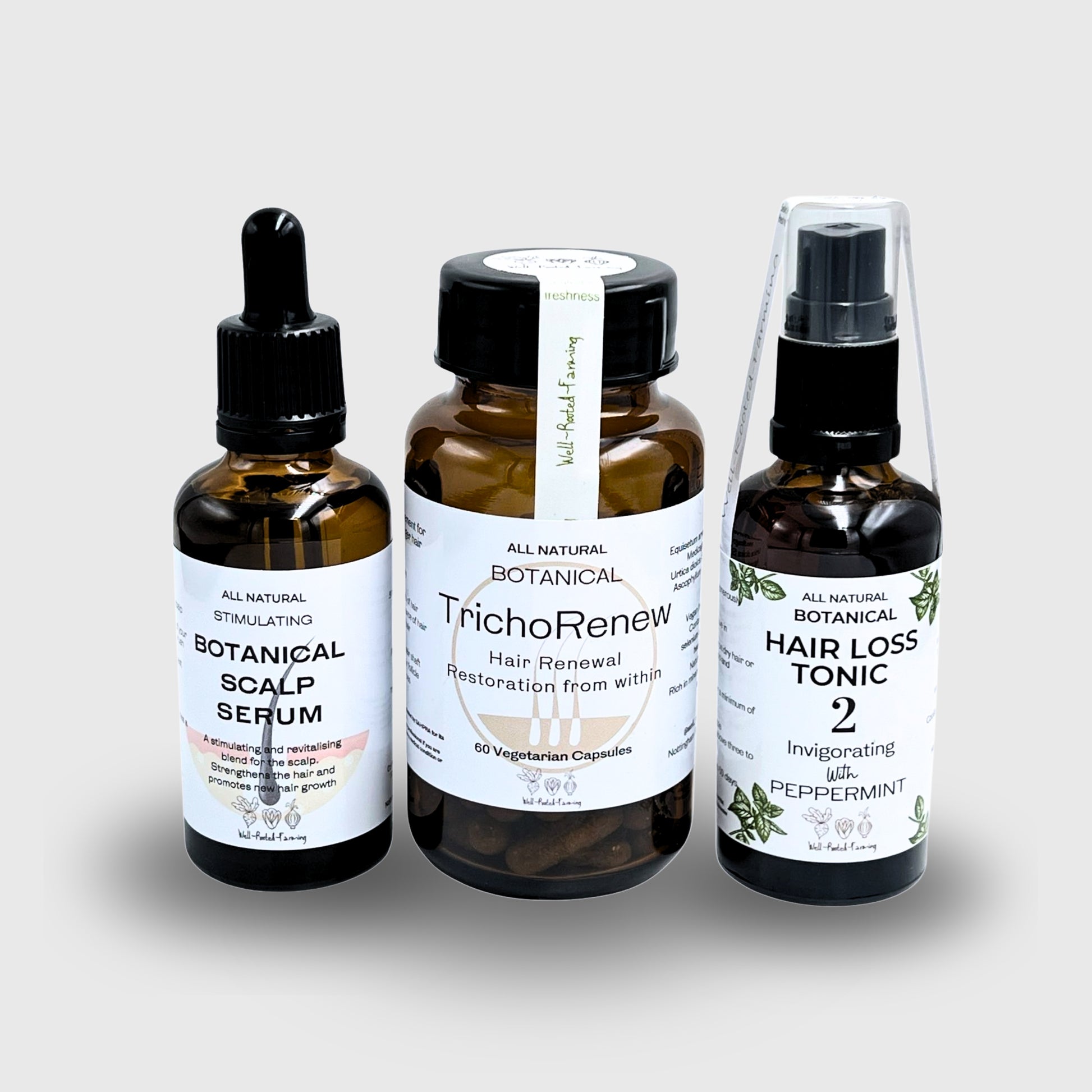 Well Rooted Farming’s TrichoRenew is formulated with a unique blend of Horsetail (Equisetum arvense), Stinging Nettle (Urtica dioica), Alfalfa (Medicago sativa), and Kelp (Ascophyllum nodosum). These carefully selected botanicals provide a rich source of silica, essential vitamins, minerals, and antioxidants to strengthen hair follicles, reduce breakage, and restore shine.